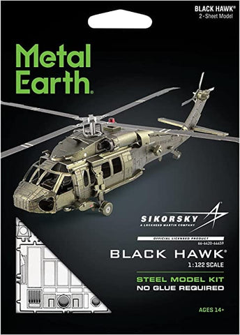 "Metal Earth - UH-60 Black Hawk" ir metāla konstruktors. Modeli iespējams izgatavot no augstas kvalitātes tērauda loksnēm. Komplektā ietilpst vienkārša instrukcija, bet modeļa veidošanai līme nav nepieciešama - vienkārši izspied detaļas no plāksnēm un aizloki savienojumus tiem paredzētajās vietās.