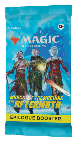 Each March of the Machine: The Aftermath Epilogue Booster contains 5 cards containing 1-3 Rare cards or less and 2-4 Uncommon cards. Each pack contains 1-2 traditional foil cards of any rarity.