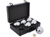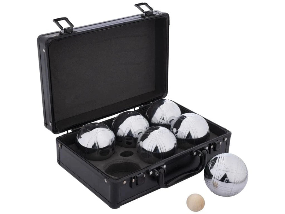 The set includes six metal balls, a casket and a suitcase for transporting the game.