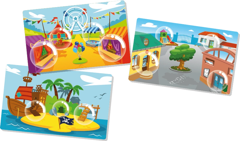 In each adventure, you must choose a location to explore. Pick up the card that matches the bubble and explore it carefully to find all the stars and complete the game objective!