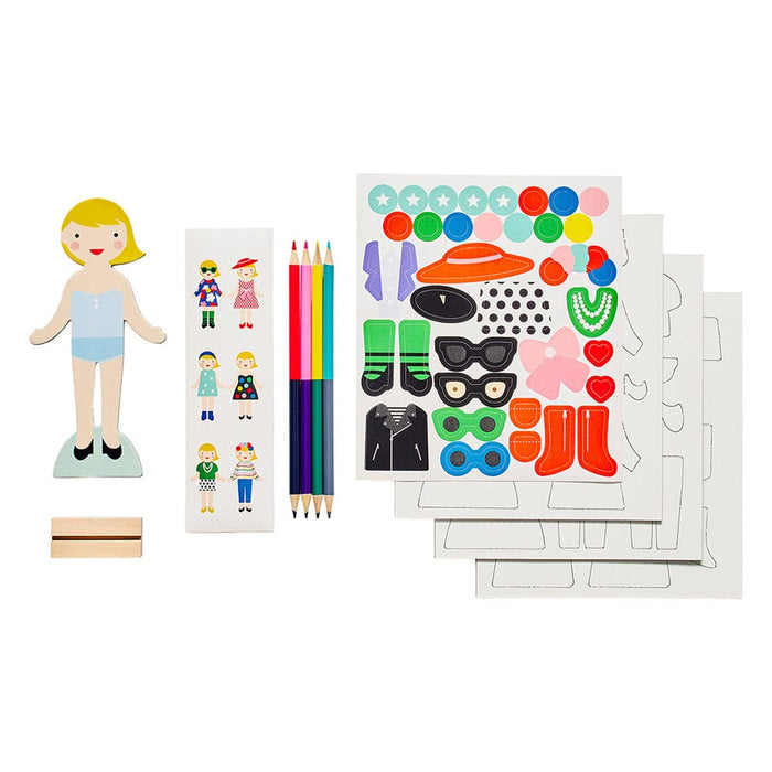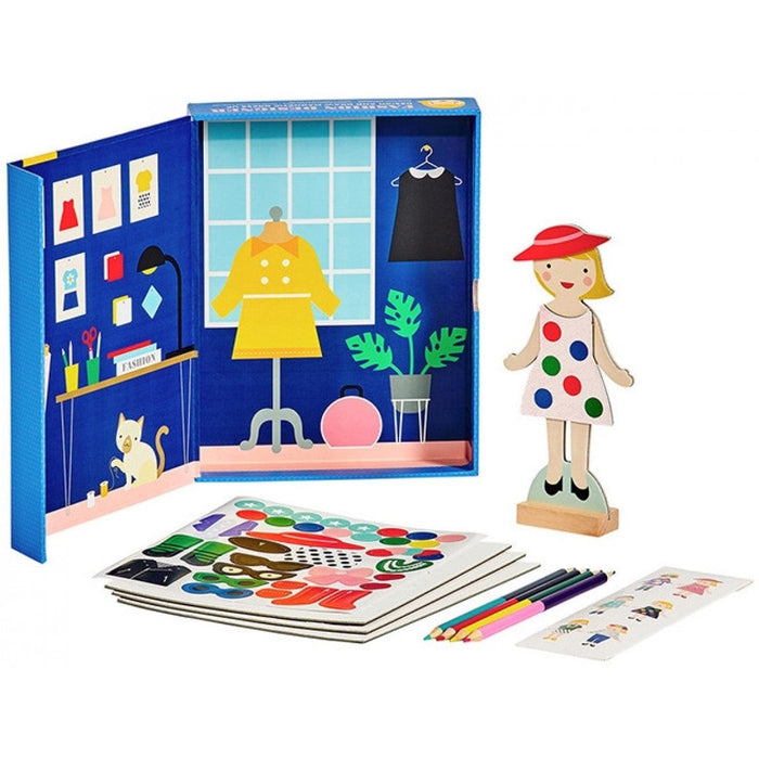 The magnetic fashion-themed outfit set includes 1 magnetic figure with a wooden stand, 36 magnetic clothing pieces, 4 double-sided crayons and 35 stickers.