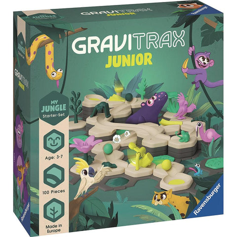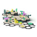 Includes: 6 base plates, 3 balls, 36 height tiles, 1 bridge, 4 straight lines, 4 slopes, 11 large curves, 4 small curves, 1 two-piece starter, 1 finisher, 1 hammer, 1 beam, 9 3D decorative elements, 4 cardboard animals, 6 foundation stones, 6 finisher caps.