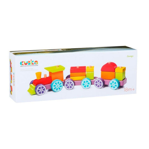 A colorful wooden train made of different figures can be disassembled and assembled by yourself. The wagons can be disconnected, the train wheels move - the toy is easy to roll.