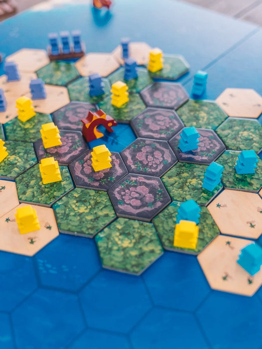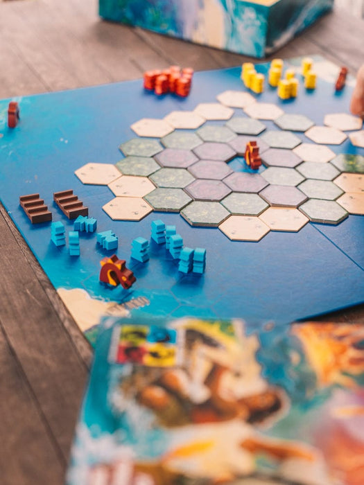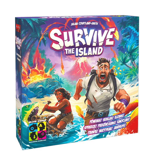 The island is slowly sinking into the ocean, and tiles are removed from the board one by one. Each player controls 10 adventurers, who try to move them to the surrounding safe islands before the volcanoes on the main island erupt. Players can swim or use rafts, but they must avoid sea snakes, monsters, and sharks along the way.