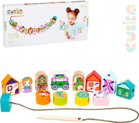 Cubika lacing game "Fairytales" is an exciting and useful pastime for children, which will attract their attention for a long time. The baby diligently drew the beads on the string, at first arbitrarily, but then following the sequence indicated on the task cards.