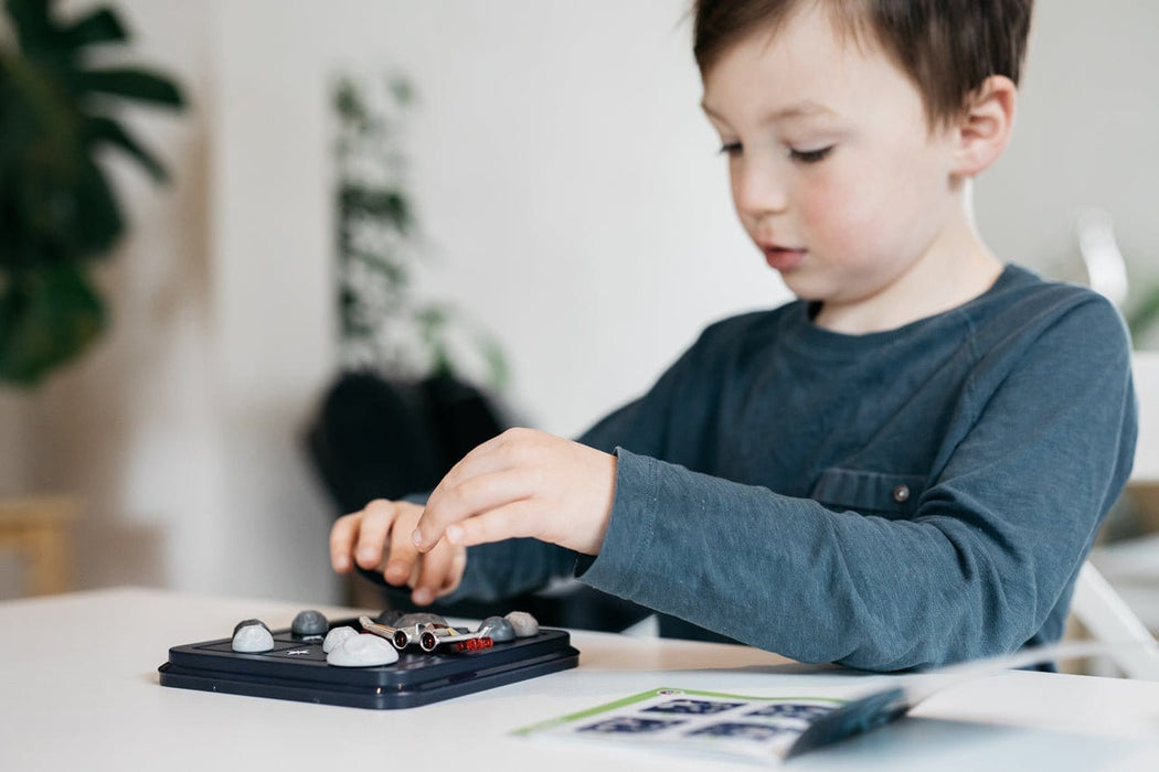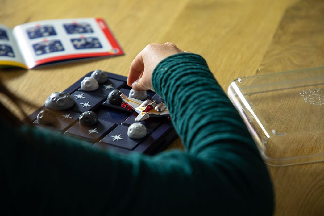 Novieto astoņas puzles daļas spēles laukumā kā attēlots uzdevumā. Pārvieto puzles daļas, lai palīdzētu kosmosa kuģim izbērgt no asteroīdu lauka. Asteroīdi un kuģis nedrīkst pārklāties.