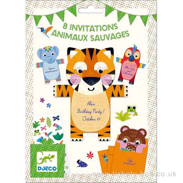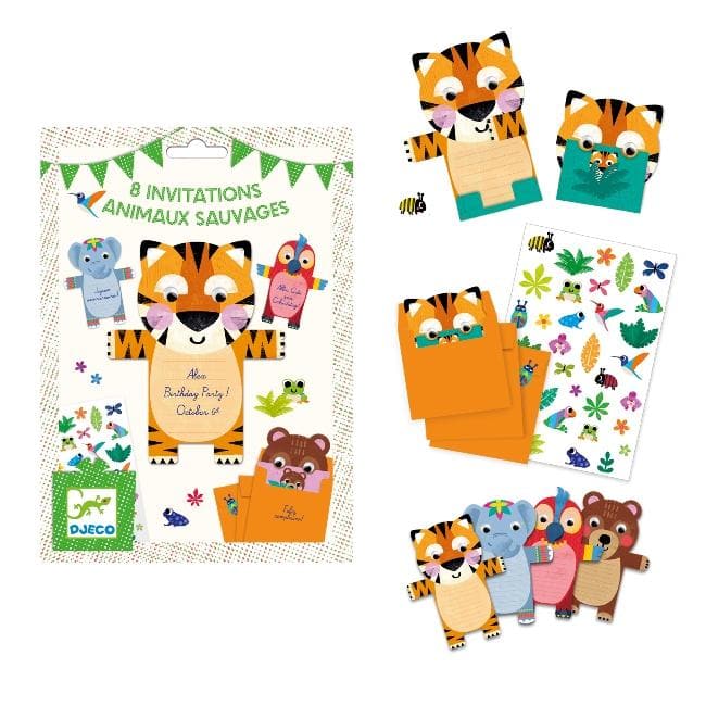 Ielūguma kartiņas ar dzīvnieku tematiku dzimšanas dienas vai citai ballītei. Komplektā astoņi ielūgumi.