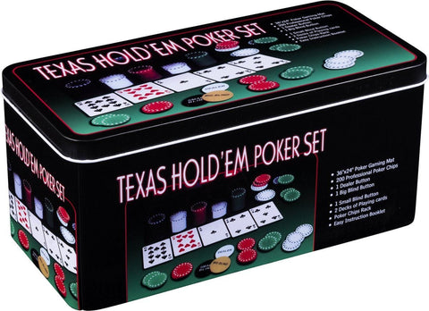 Komplektā: 200 čipi, 2 spēļu kāršu iepakojumi, spēļu paklājs, žetonu turētājs, dīlera žetons, mazais blinds žetons, lielais blinds žetons un spēles noteikumi.