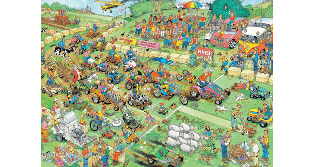 Puzle "Jan van Haasteren: Lawn Mower Race" ar 1000 puzles gabaliņiem.