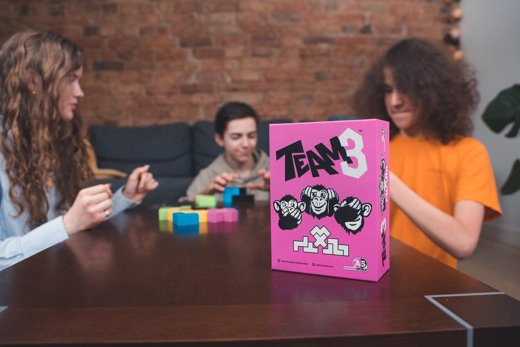 „TEAM3“ ir sadarbības spēle, kurā spēlētāji strādā kopā, iekļaujoties laika limitā, lai pabeigtu celtni, kas redzama viņu plānu kārtī. Taču ir kāds āķis! Strādājot trīs darbinieku komandā, katrs spēlētājs uzņemas īpašu lomu (kas atbilst viņam iedalītajai kārtij): spēlētājs, kurš nevar runāt, spēlētājs, kurš nevar redzēt, un spēlētājs, kurš ir pa vidu. Ja spēlētāji izpilda pietiekami daudz plānu, tad viņi spēlē uzvar! Taču, ja spēlētāji pārāk daudz reižu cieš neveiksmi, tad viņi zaudē!