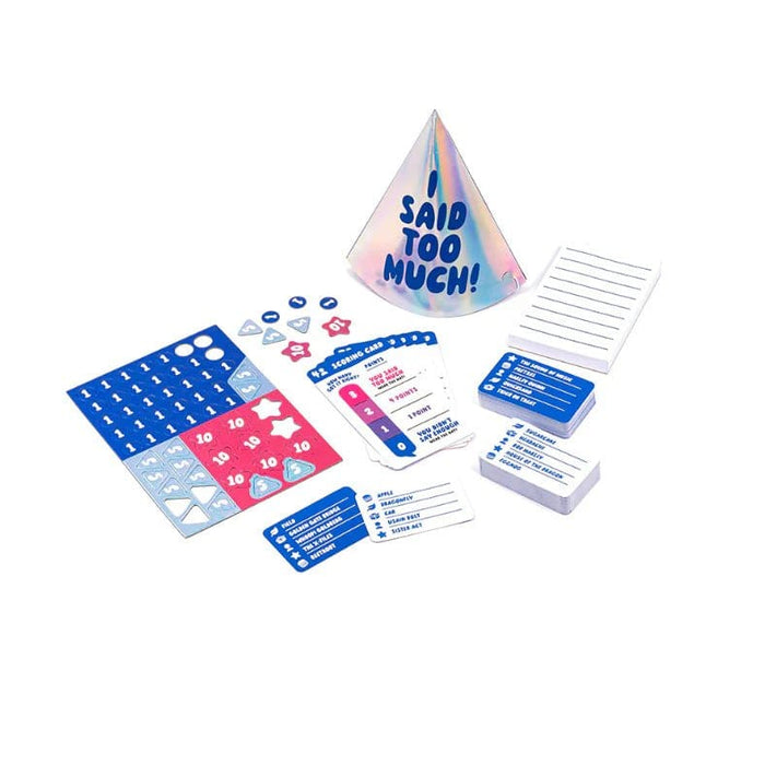 Komplektā ir 100 spēļu kārtis ar 1000 vārdiem, 56 punktu skaitīšanas žetoni, 5 punktu kartītes, cepure, atbilžu bloks un noteikumi.