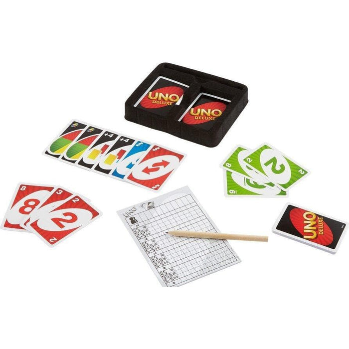 Deluxe komplektā nāk metāla kastīte kāršu glabāšanai, punktu skaitīšanas tabula un zīmulis.