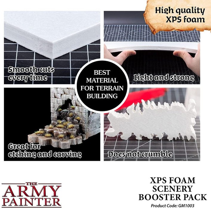 XPS Scenery & Terrain Foam Booster Pack satur tīras augstas kvalitātes XPS putuplasta plāksnes. XPS putas ir ainavu celtniecības materiāls, kam dod priekšroku pieredzējuši reljefa un ainavu celtnieki. Putupolistirola loksnes ir izturīgas un ļoti blīvas, kas ļauj iegūt izcili izteiksmīgas detaļas, kad tās tiek grieztas un iespiestas ar tekstūru.